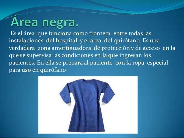 - 4. Es el área que funciona como frontera entre todas lasinstalaciones del hospital y el área del quirófano. Es unaverdadera zona amortiguadora de protección y de acceso en laque se supervisa las condiciones en la que ingresan lospacientes. En ella se prepara al paciente con la ropa especialpara uso en quirófano