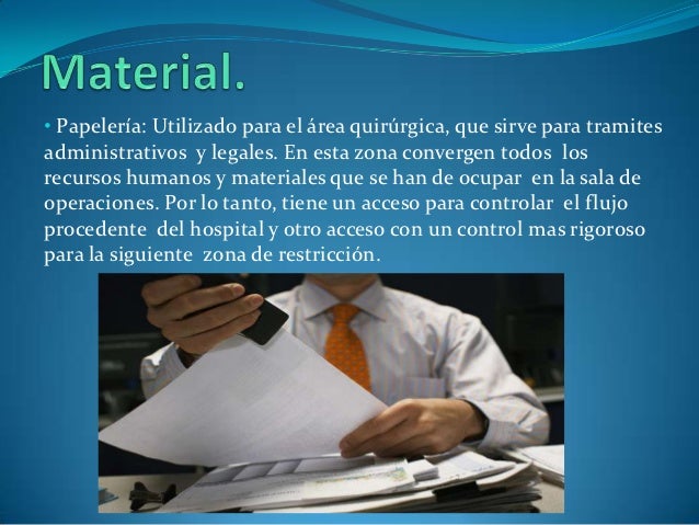 - 6. • Papelería: Utilizado para el área quirúrgica, que sirve para tramitesadministrativos y legales. En esta zona convergen todos losrecursos humanos y materiales que se han de ocupar en la sala deoperaciones. Por lo tanto, tiene un acceso para controlar el flujoprocedente del hospital y otro acceso con un control mas rigorosopara la siguiente zona de restricción.