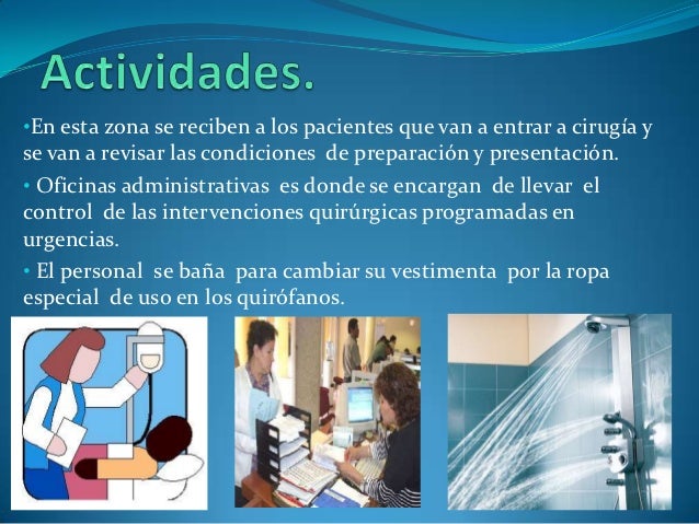 - 7. •En esta zona se reciben a los pacientes que van a entrar a cirugía yse van a revisar las condiciones de preparación y presentación.• Oficinas administrativas es donde se encargan de llevar elcontrol de las intervenciones quirúrgicas programadas enurgencias.• El personal se baña para cambiar su vestimenta por la ropaespecial de uso en los quirófanos.